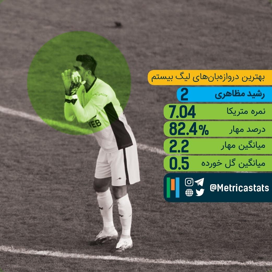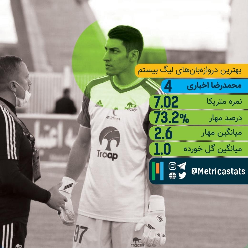 محمدرضا اخباری به طور مشترک با پیام نیازمند، بیشترین میانگین مهار شوت را در هر بازی داشت. اخباری نزدیک به 27% از شوتهای در چارچوبش را گل خورد و با نمره متریکا 7.02 جزو چهار دروازهبان برتر لیگ بیستم جای گرفت.
