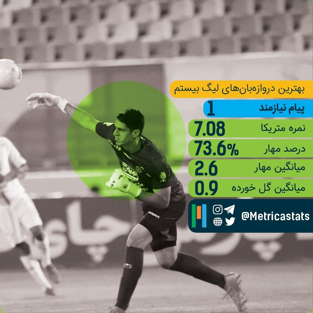 متریکا؛ مرجع آماری و فنی فوتبال ایران- در لیگ بیستم رقابت جذابی بین دروازهها شکل گرفته بود. نیازمند میانگین مهار شوت بالاتری نسبت به لک و مظاهری داشت. پیام در کار با پا هم دقیقتر از بقیه بود و بالاترین دقت پاس را بین همه دروازهبانهای لیگ داشت. نیازمند تنها دروازهبان فصل بود که بیش از یک پنالتی مهار کرد. آمارهایی که باعث شد با نمره متریکا 7.08 بهترین دروازهبان لیگ بیستم معرفی شود. نیازمند در پایان فصل هم لژیونر شد و به لیگ پرتغال رفت.