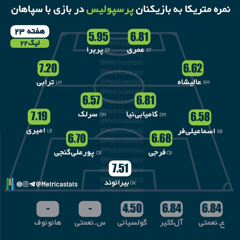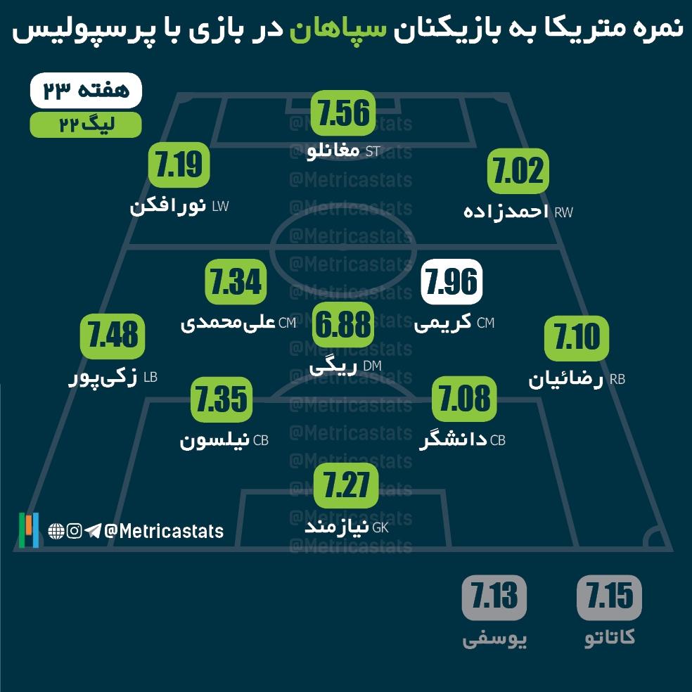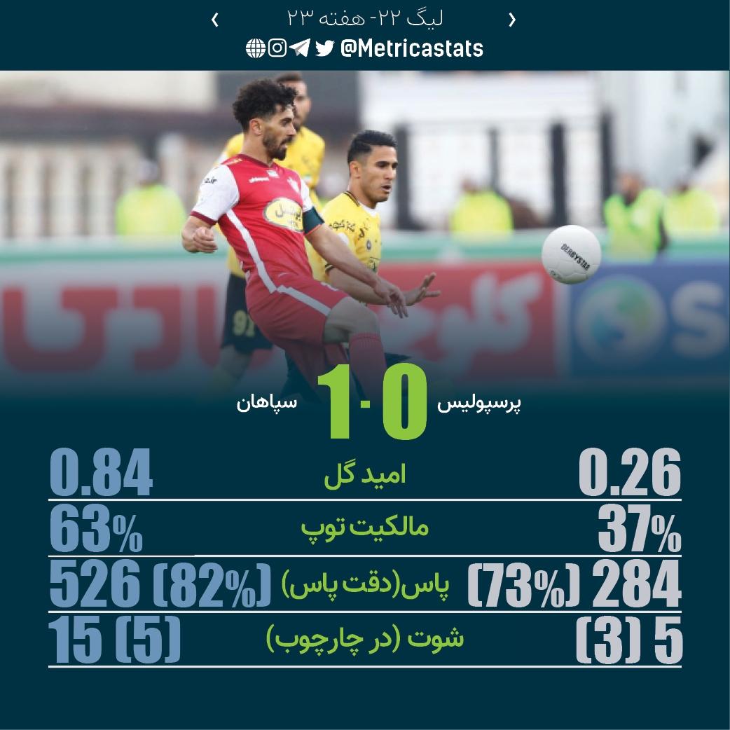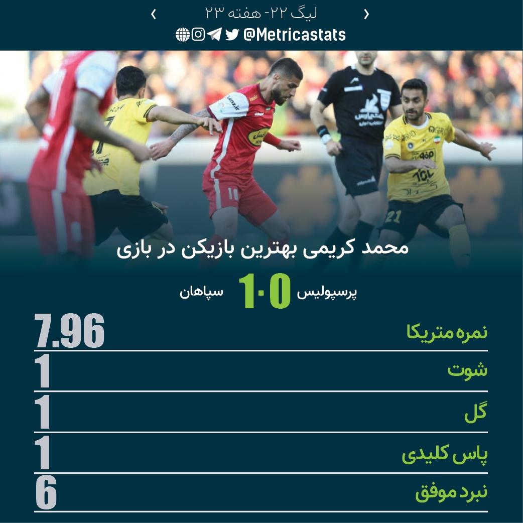 متریکا؛ مرجع آماری فوتبال ایران- در حساس ترین بازی هفته، سپاهان بیشتر صاحب توپ بود و بیشتر حمله کرد و حملاتش خطرناکتر بود و توانست پرسپولیس را شکست دهد. محمد کریمی زننده تک گل بازی، بهترین بازیکن زمین شد.
