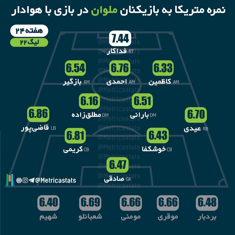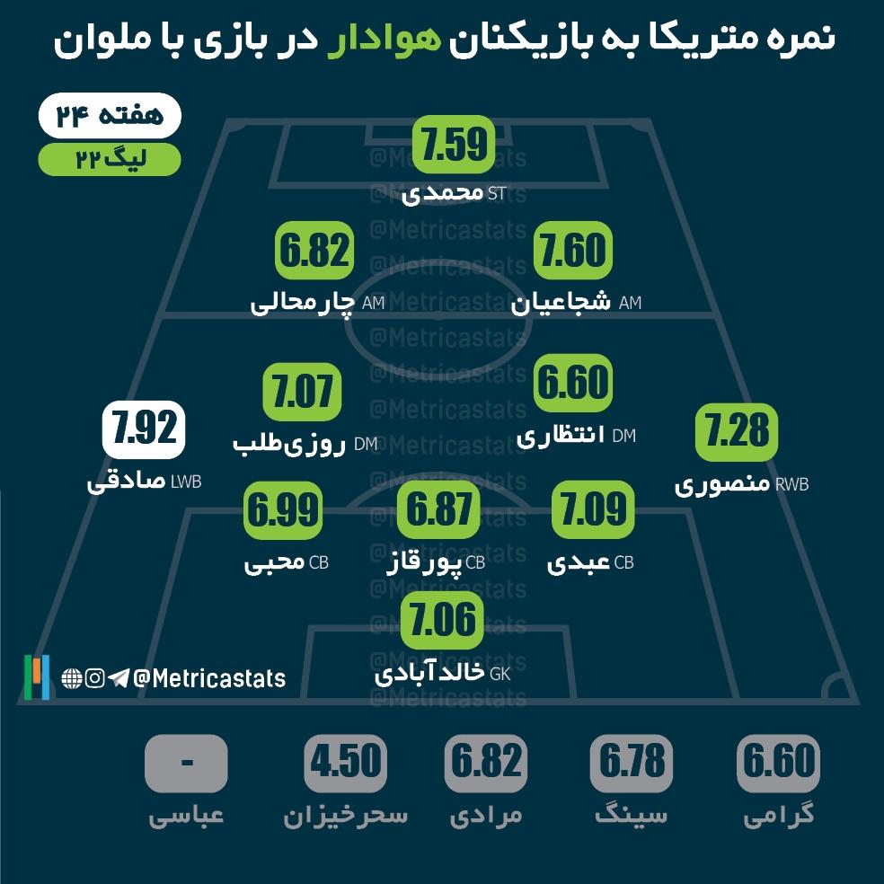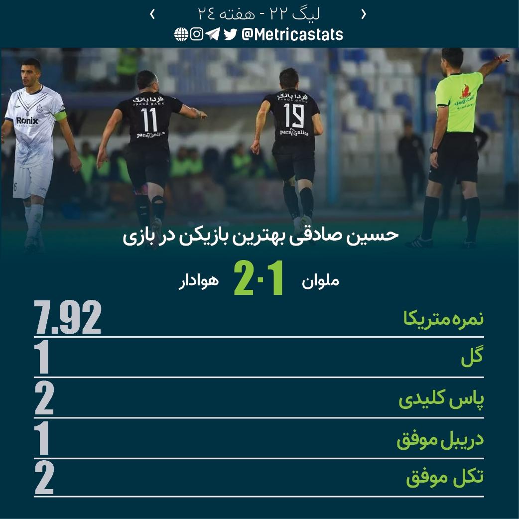 ⭐️حسین صادقی با یک گل و ۲ پاس کلیدی و نمره متریکا 7.92 بهترین بازیکن زمین شد.