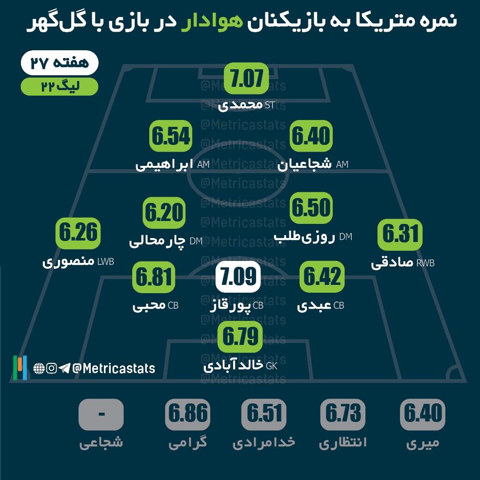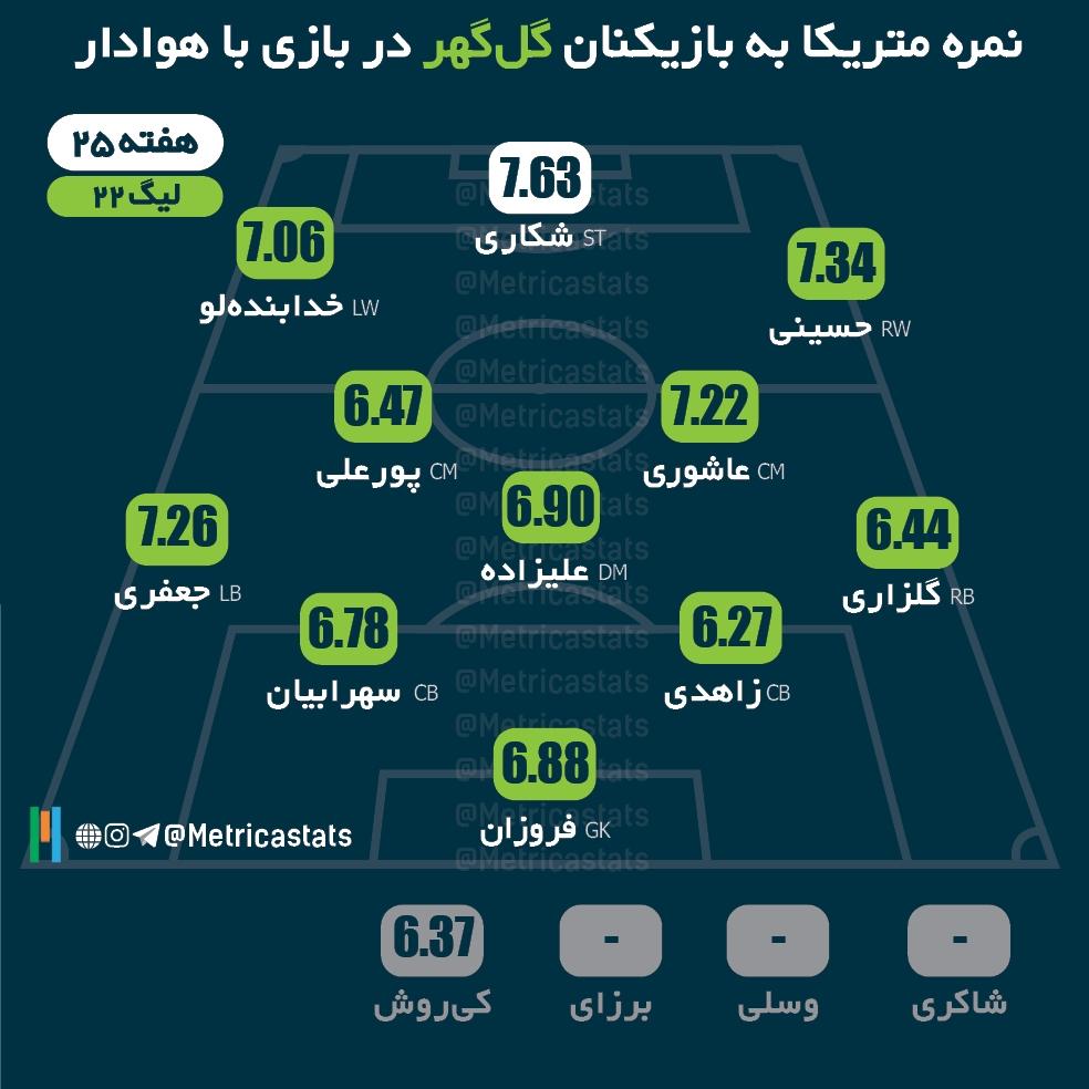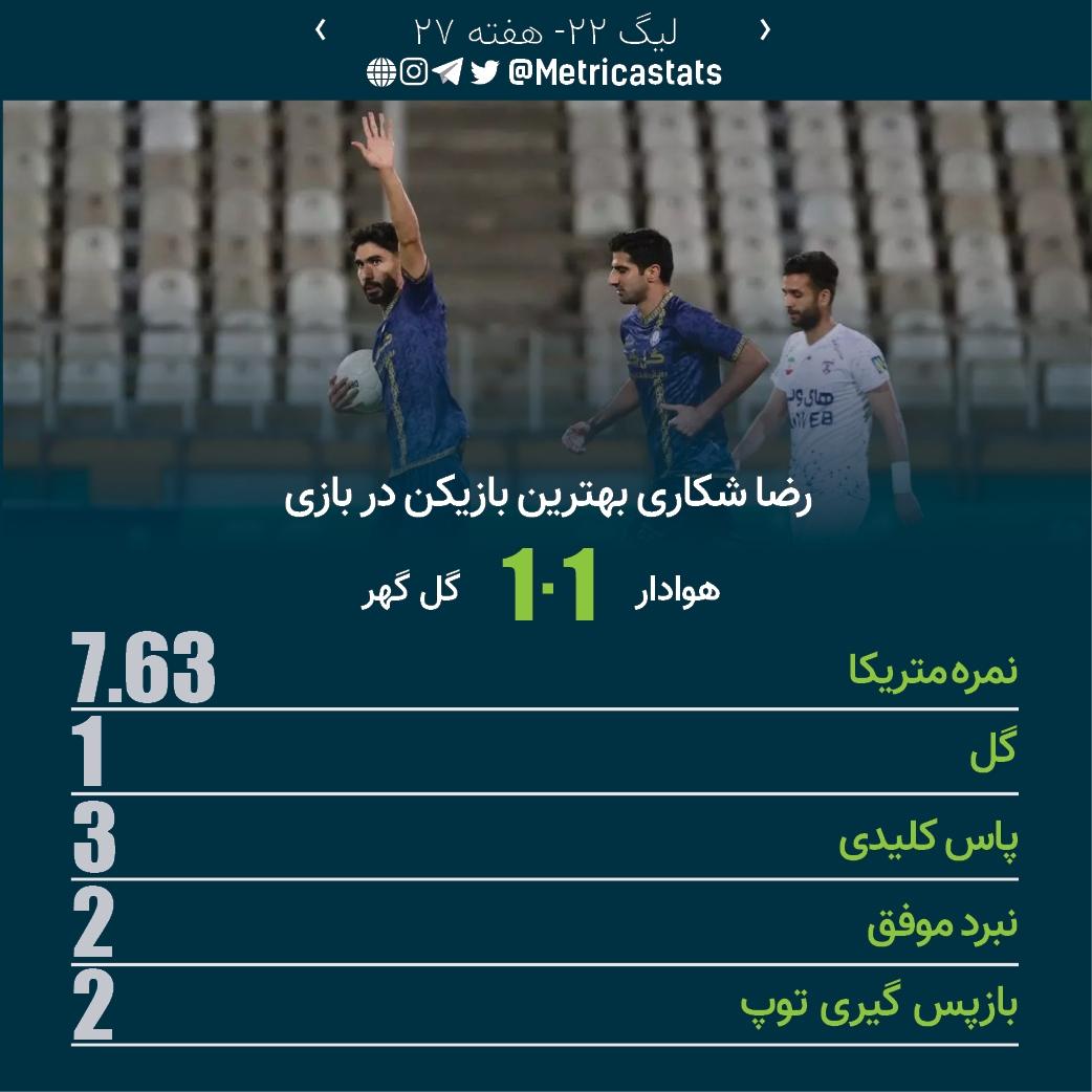 ⭐️ رضا شکاری تک گل تیمش را به ثمر رساند و با نمره متریکا ۷.۶۳ بهترین بازیکن زمین شد. شکاری با ۷ گل بهترین گلزن این فصل گلگهر است.