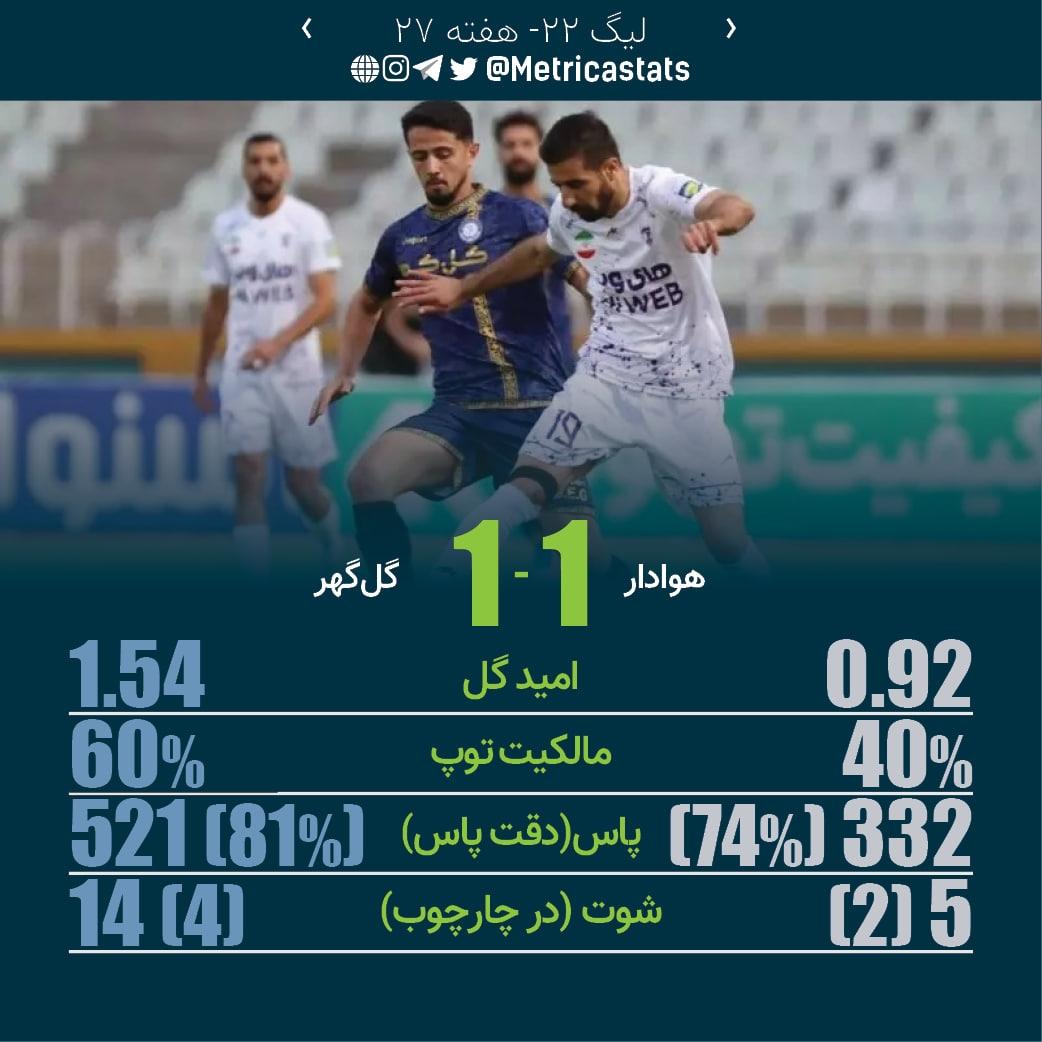متریکا؛ مرجع آماری فوتبال ایران- گلگهر علیرغم برتری در فاکتورهای فنی نتوانست هوادار را شکست دهد. این اولین باری است که هوادار موفق به کسب امتیاز مقابل گلگهر میشود.